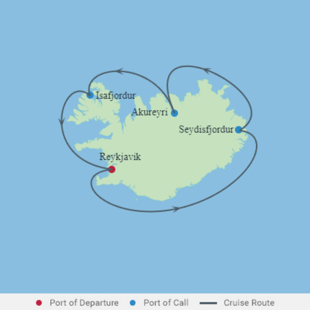 Begin your Icelandic journey in Reykjavik, a vibrant capital city offering a blend of rich culture, captivating nightlife, and a perfect gateway to Iceland's natural wonders. Then, travel to Seydisfjordur, which invites travelers to its picturesque fjord, known for the charming Rainbow Street and as a serene stop for exploring the Eastfjords. Next, discover Akureyri, the capital of the north and thriving cultural hub nestled along a fjord, providing easy access to the stunning Lake Mývatn area and its geothermal marvels. Finally, experience Isafjordur, a historic trading town and the gateway to the remote Westfjords, beckoning adventurers with dramatic landscapes and authentic Icelandic maritime culture before returning to disembark in Rekyjavik.